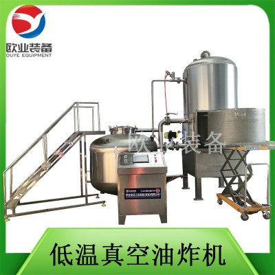 1、加熱、油炸、儲油、脫油、脫水、油過濾一體化設計,在真空下連續性完成,產品含油量低,產品處于真空狀態,在這種相對缺氧的條件下進行食品加工,可以減輕甚至避免氧化作用(例如脂肪酸敗、酶促褐變和其他氧化變質等)所帶來的危害。歐業真空油炸機在負壓狀態,以油作為傳熱媒介,食品內部的水分(自由水和部分結合水)會急劇蒸發而噴出,使組織形成疏松多孔的結構。