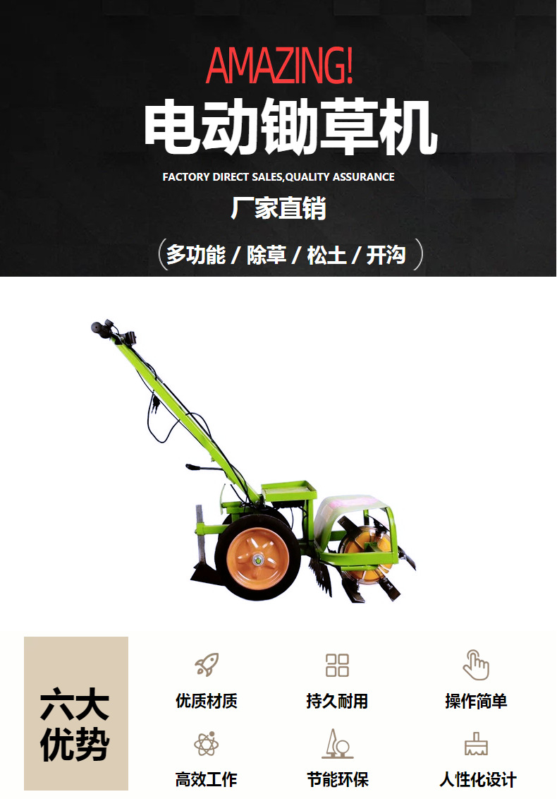 商品描述 手扶電動鋤草機除草機 開荒機 翻地除草神器 松土機 除草鋤草神器 鋰電除草機 開溝機 犁地機 起壟回填機 小型充電式鋤地機 家用鋰電除草機 電動鋤草機微耕機除草機