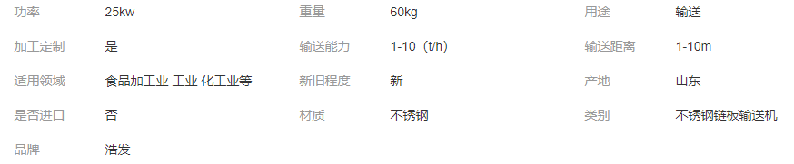 公司的產品型號有哪些? 鏈板輸送機的節距是否均勻? 鏈板輸送機的輸送距離是多少? 浩發鏈條機械有哪些其他產品? 產品是焊接制作的嗎? 物料在輸送線之間過渡平穩嗎? "這款送輸機是否耐用?", 公司有哪些先進的生產設備? |