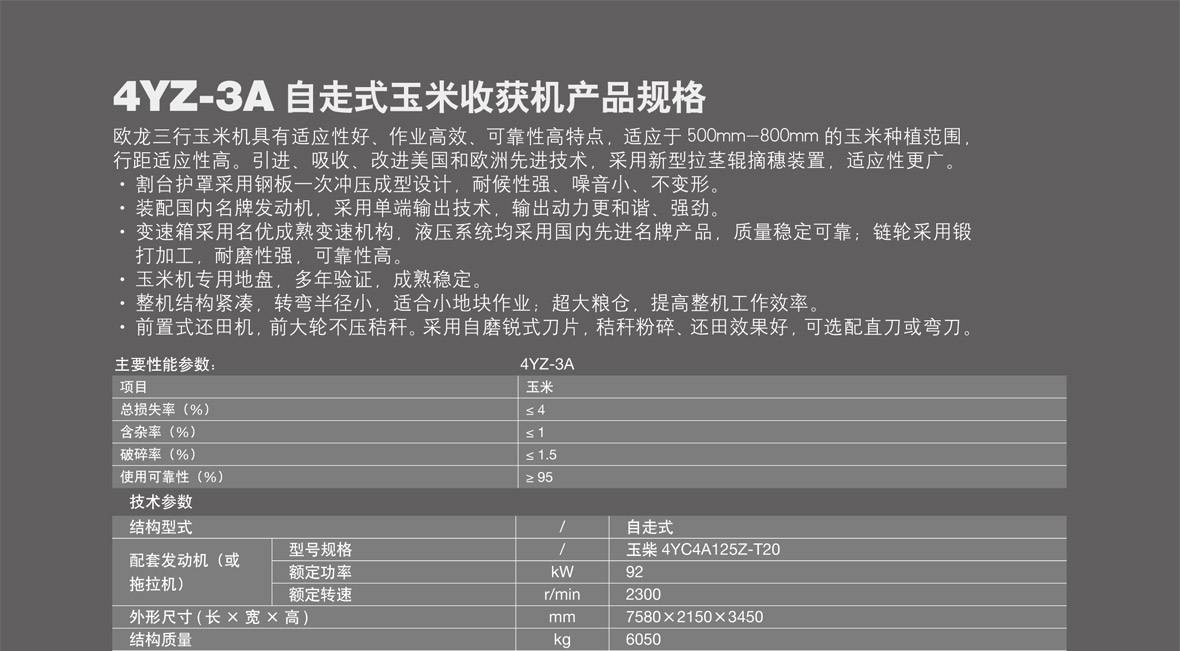 歐龍三行玉米機具有適應性好、作業高效、可靠性高特點,適應于500mm-800mm的玉米種植范圍,行距適應性高。引進、吸收、改進美國和歐洲先進技術,采用新型拉莖輥摘穗裝置,適應性更廣。