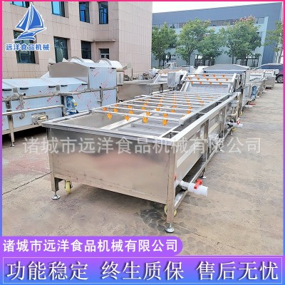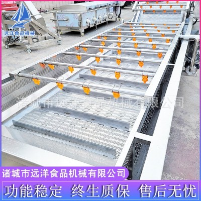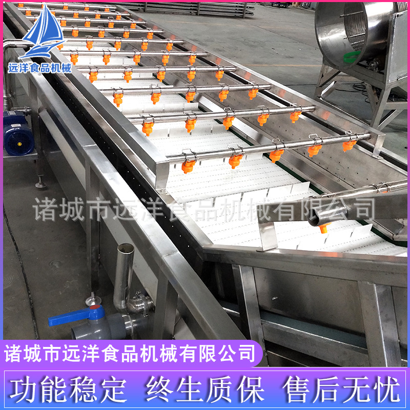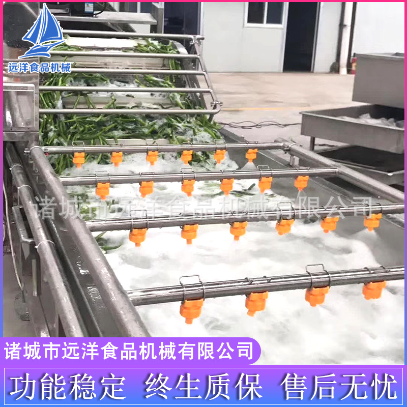 蔬菜氣泡清洗機清洗切后的莖葉、莖桿物料等在高壓、翻滾的氣泡內行走,高壓清水噴淋、冷卻增氧泵通過管路及管孔從噴淋桶底噴出翻滾的泡泡達到消毒清洗的目的。專業蔬菜清洗機可清洗薯、根、球、塊類物料在高壓翻滾氣泡行走、高壓清洗噴淋。莖、葉類雙層板鏈自動行走,氣泡蔬菜清洗機高壓氣泡沖洗。