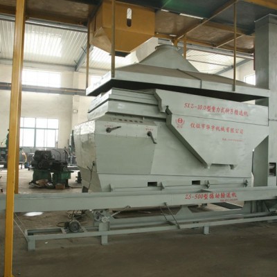 1.總體要求 1.15XT-10種子加工成套設備包括與種子加工相適應的種子加工設備及配套、附屬裝置,應當能夠連續完成種子清選、玉米種子分級、包衣、烘干等加工; 1.2加工設備主要包括5XT-12風篩清選機、比重清選機、平面種子分級機、包衣機、包衣烘干機; 1.3配套、附屬裝置包括輸送系統、除塵系統、排雜系統、貯存系統、電控系統; 1.4種子加工成套設備生產能力≥10t∕h; 1.5成套設備固定安裝在加工廠房內,廠房高度、面積、地面處理等滿足設備安裝條件和種子加工流程要求; 1.6設備及配套附屬裝置的生產、安裝、種子加工質量等應當符合JB∕T5683—93《種子加工成套設備技術條件》和有關標準規定。 2.種子加工流程和主要設備 2.1基本流程和主要設備: 風篩清選機→比重清選機→玉米種子分級機→包衣機→包衣種子成膜倉→包衣烘干機 3.種子清選、種子比重選、玉米種子分級機、包衣、包衣烘干 3.1風篩清選機 3.1.1有前、后吸風道,雙沉降室; 3.1.2木制雙篩箱,篩片5層15片,橡膠球清篩; 3.1.3有底部風機 3.1.4,生產率達12T/H 3.1.5采用先進的振動給料喂料使喂料更均勻、準確 篩箱電機采用變頻器無極調速 3.1.6底部風機采用外轉子低噪音雙風機,風量大小通過變頻器進行無極調節 3.1.7技術指標 生產能力:12(T/H) 風機轉速:140-700(r/min) 篩箱振動頻率:70-350(rpm) 外形尺寸:3965*1950*4100(mm) 凈重:3(t) 功率①風機4(kw)②振動5.5(kw)③喂料0.3(kw) 篩面面積:15m2 篩振幅:28(mm) 篩層數和片數:5層15片 配有篩選水稻種子、玉米種子、棉花種子的篩片 4種子分級機