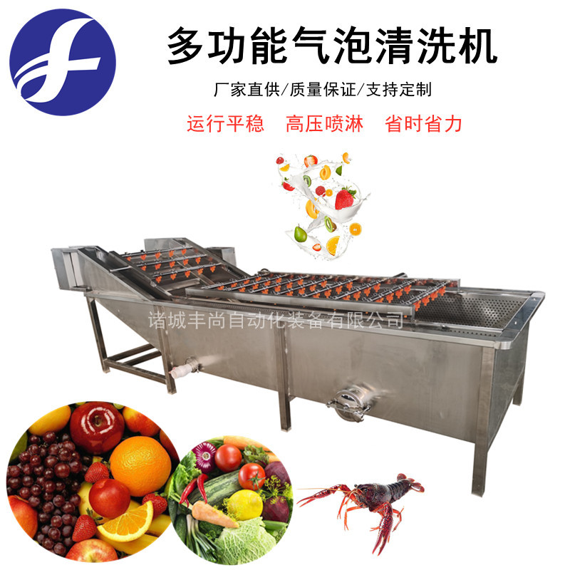 氣泡清洗機是水果,蔬菜,水產生產線中的重要產品,主要用于水果,蔬菜,水產的清洗。氣泡清洗機的原理主要是利用箱體前部分設備箱體中注適量的水,原料在經過箱體時,會與氣泡機和水的結合作用下做翻滾狀態,并隨網帶不斷向前推進,在出水面時,設有噴淋頭,高壓沖洗。 氣泡清洗機是針對外形要求高的物料設計,適用于:蔬菜、水果、水產品、中草藥等顆粒狀、葉狀、根莖類產品清洗、浸泡。