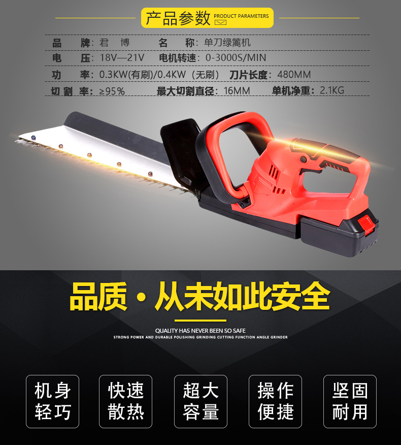 詳細信息 產地浙江麗水 是否進口否 品牌君博 型號無刷 有刷 名稱綠籬機 材質鋁合金 加工定制是 適用范圍園林 庭院 綠化 茶園 單品重量2.5KG 凈重2.2KG 規格單刀無刷,單刀有刷 是否跨境出口專供貨源否 工業級鋰電綠籬機, 歐規 美規 國標為常規配置, 誠招跨境電商、電商及線下渠道代理。