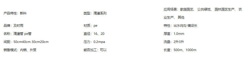 主營產(chǎn)品 : 滴灌微噴 過濾器施肥器 pe管材管件 水肥一體機