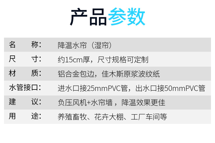 產(chǎn)品規(guī)格鋁合金帶返水槽水簾*1平方(定制款,3平方起訂),溫控器WK2-1(單路220V溫控),溫控器WK3-1(單溫控+時控),溫控器WK3-2(雙路溫控+時控),溫控器WK3-4 (四路階梯溫控+時控帶熱保護,0.75KW三相電水簾水泵*1臺