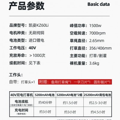 商品描述 凱姿KZ60LI電動(dòng)割草機(jī) 割灌機(jī) 充電式多功能開(kāi)荒園林鋰電池除草機(jī)