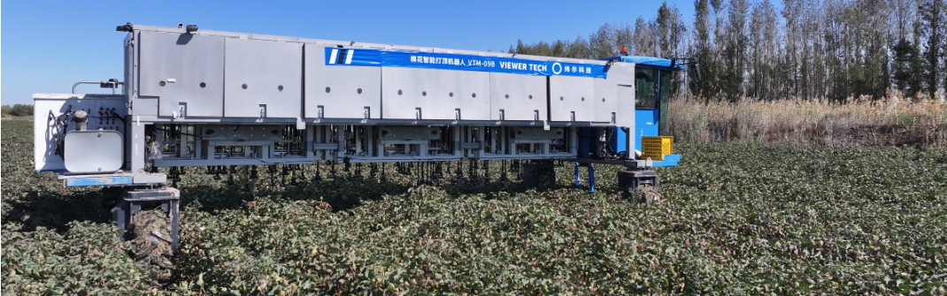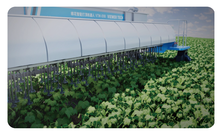 棉花智能打頂機器人VTM-09B專為棉花種植打頂場景下打造的農業機器人,配備傳感器和機器視覺 系統,能夠精準識別棉花頂芽,模仿人工打頂操作,實現高效、精準的作業。借助農藝大模型與實時環境 感知技術,動態調整打頂策略,即便在夜間也能持續作業,有效緩解了農忙期勞動力短缺的問題。