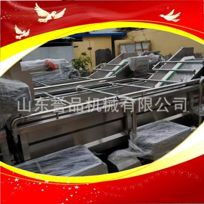 氣泡清洗機是利用漩渦氣泵產生的高壓氣流,通過浸入在水槽中的曝氣管產生的氣泡群對物料進行沖擊、按摩搓洗,防人工搓洗,將粘附在果蔬上的泥土、泥沙、植物桔梗、枝葉等雜物剝離、比重大體積小的異物在自身的重力作用下會沉到槽底,由排污口排出,比重小的漂浮物在水流和波動的推動下進入漂浮物撈取裝置,物料體積大的進入下道工序。