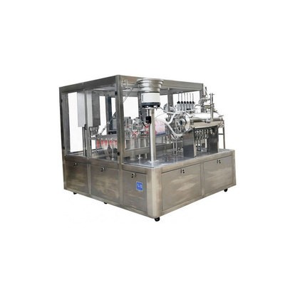 特點:本機從自動定位—自動吹氣—自動定量兩次灌裝—自動清洗—自動下蓋—自動旋蓋—自動出袋