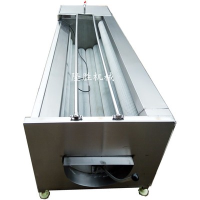 毛輥在電機(jī)的帶動(dòng)下通過(guò)相對(duì)逆向滾動(dòng),與產(chǎn)品直接接觸產(chǎn)生摩擦達(dá)到去皮效果;并設(shè)有特制的自動(dòng)高壓噴淋噴頭進(jìn)行邊去皮邊沖洗,即可達(dá)到產(chǎn)品清洗并去皮的效果;并可根據(jù)產(chǎn)品品種更換毛刷棍毛的硬度,選用絲質(zhì)較硬的毛刷輥,可以達(dá)到根莖類果蔬去皮效果,選用絲質(zhì)較軟的毛刷輥,可達(dá)到給果蔬上臘拋光的作用。并要注意的是,工作時(shí)要先開機(jī)運(yùn)行后再投料,這樣可以延長(zhǎng)電機(jī)壽命,減少電機(jī)損壞的機(jī)率。