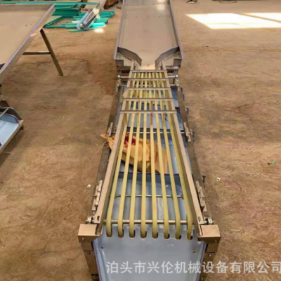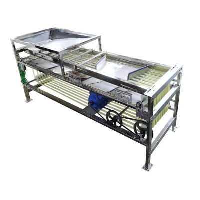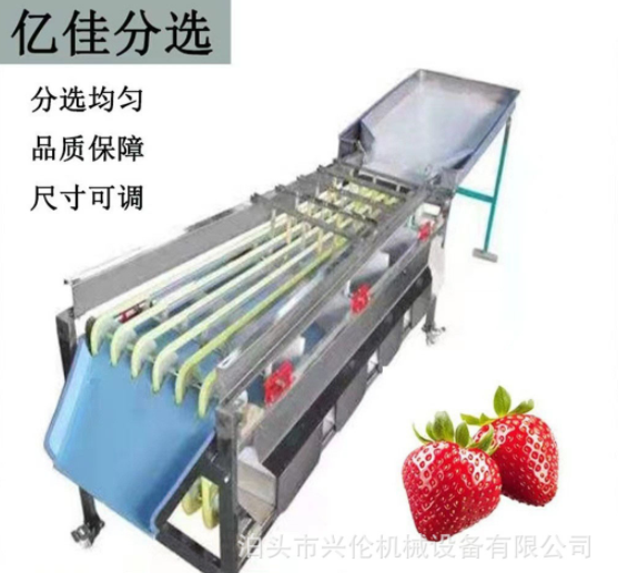 選果機的傳送帶選用硅橡膠材料制作,韌性好,克服了傳送帶易裂、易斷、易老化的弊端,軌道槽堅固、不易變形;V型槽之間用嚙齒軸套相隔,可方便調整傳送帶的間距,達到了一機多用的效果(圣女果、蒜米、新疆大棗、灰棗、金絲小棗、山楂、沙棘、金桔、沙糖桔、荔枝、龍眼等小型果蔬果實),機身長度增加到三米,可以根據果蔬直徑大小將果蔬分成4-7個等級,選果均勻、等級分的細。針對怕傷皮的果品篩選的過程中不容易損傷果皮,篩選效果均勻。