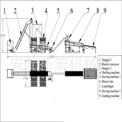 (10刀位)標準配置包含1進料斗+1提升機+1分料斗+4臺脫殼機(10刀位)+1振動分離篩