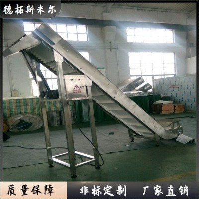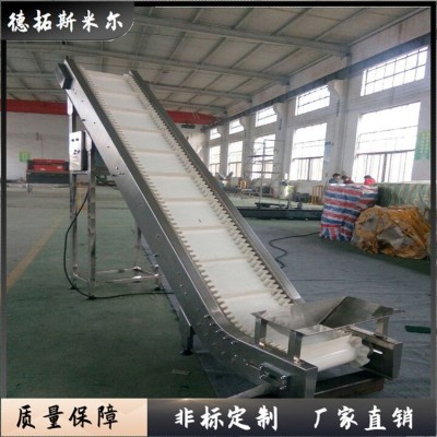 爬坡皮帶輸送機適用于樓層差間的貨物的連續輸送。傾斜角度小(≤30°)的爬坡皮帶機,在皮帶上加裝檔條、治具、裙邊等方式從而使物體能在較大的角度上作提升輸送。如食品、注塑件、粉末以及各種零件行業。