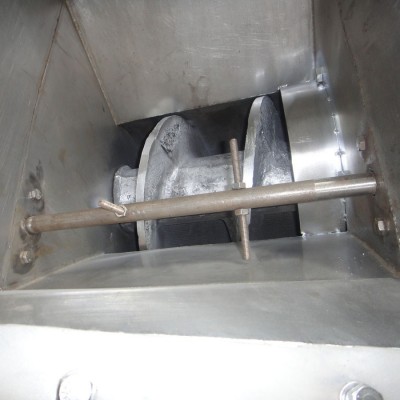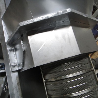 本雙螺旋式壓榨機(jī)工作過(guò)程是:輸送螺旋將進(jìn)入料箱的物料推向壓榨螺旋,通過(guò)壓榨螺旋的螺距減小和軸徑增大,并在篩壁和錐形體阻力的作用下,使物料所含的液體物(果汁)被擠壓出.擠出的液體從篩孔中流出,集中在接汁斗內(nèi).壓榨后的果渣,經(jīng)篩筒末端與錐形體之間排出機(jī)外,錐形體后部裝有彈簧,通過(guò)調(diào)節(jié)彈簧的預(yù)緊力和位置,可改變排阻力和出渣口的大小,用來(lái)調(diào)節(jié)壓榨的干濕程度. 5、10、20噸/時(shí)壓榨機(jī)為雙螺旋轉(zhuǎn),旋轉(zhuǎn)方向相反,對(duì)物料的壓榨力大而均勻,出渣口錐形體由液壓缸控制,調(diào)節(jié)油壓可改變對(duì)物料的施壓效果,調(diào)整出汁率,本機(jī)還可用于其它物料的固液分離,其效果因物料品質(zhì)不同有一定的差別。本機(jī)的進(jìn)料箱和篩筒及螺旋均采用耐酸堿304不銹鋼材料制造。