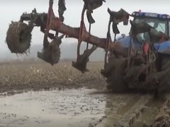 國外拖拉機在泥水中搶翻玉米地