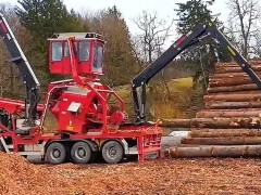 不可思議的移動式剝皮機,帶樹皮的木頭推進去,光溜溜的送出來